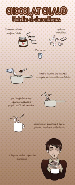 Puisqu'une image vaut mieux qu'un long discours voici l'infographie des ingrédients pour réaliser votre boisson chaude chocolaté.
