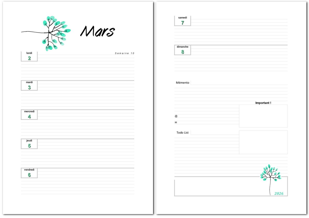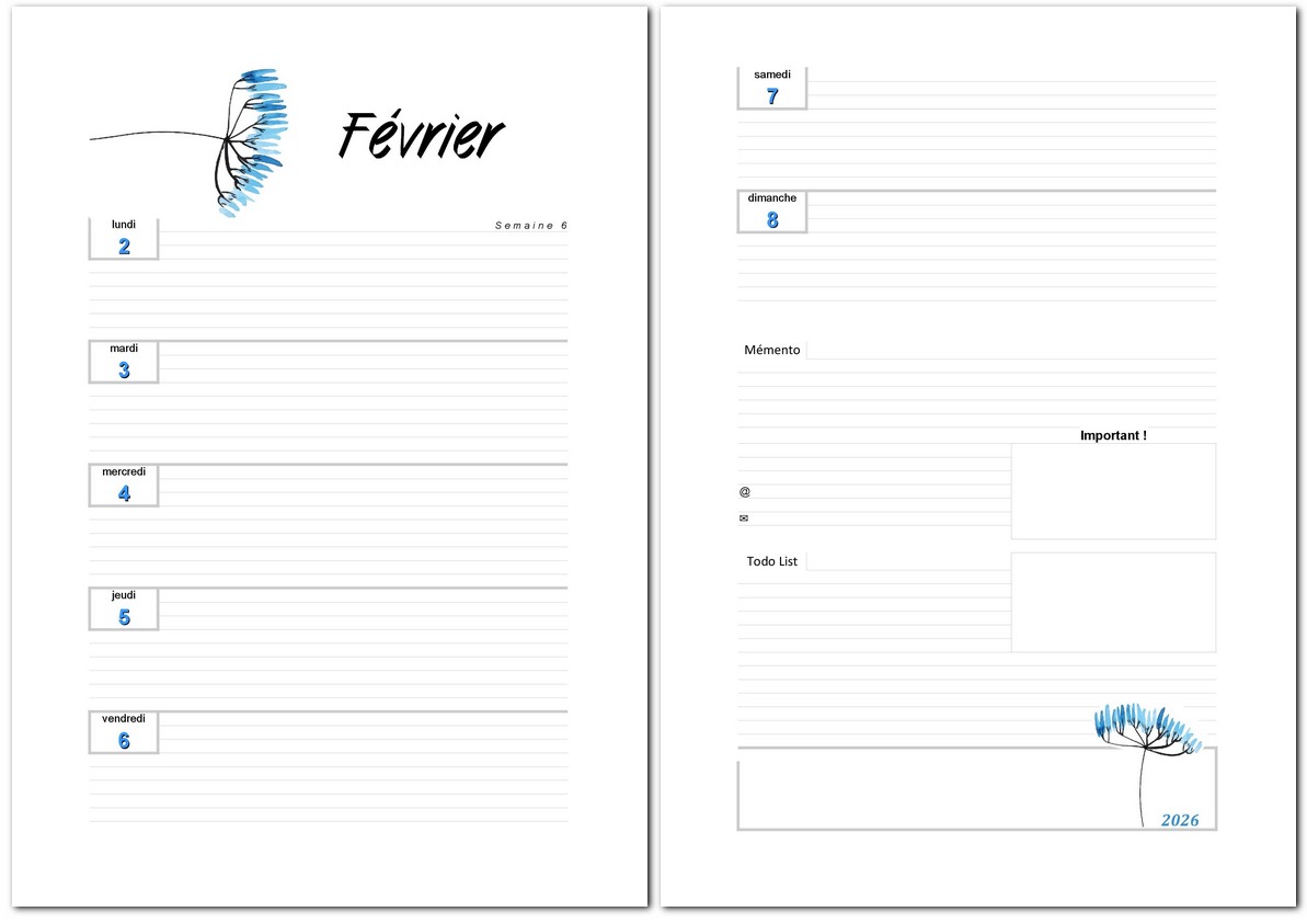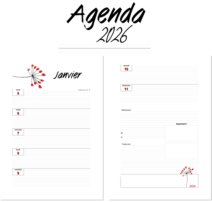 Imprimez gratuitement notre agenda semainier de 2026 au format PDF A4 ou A5.