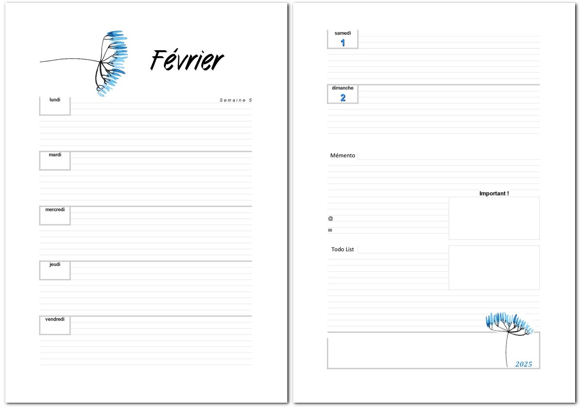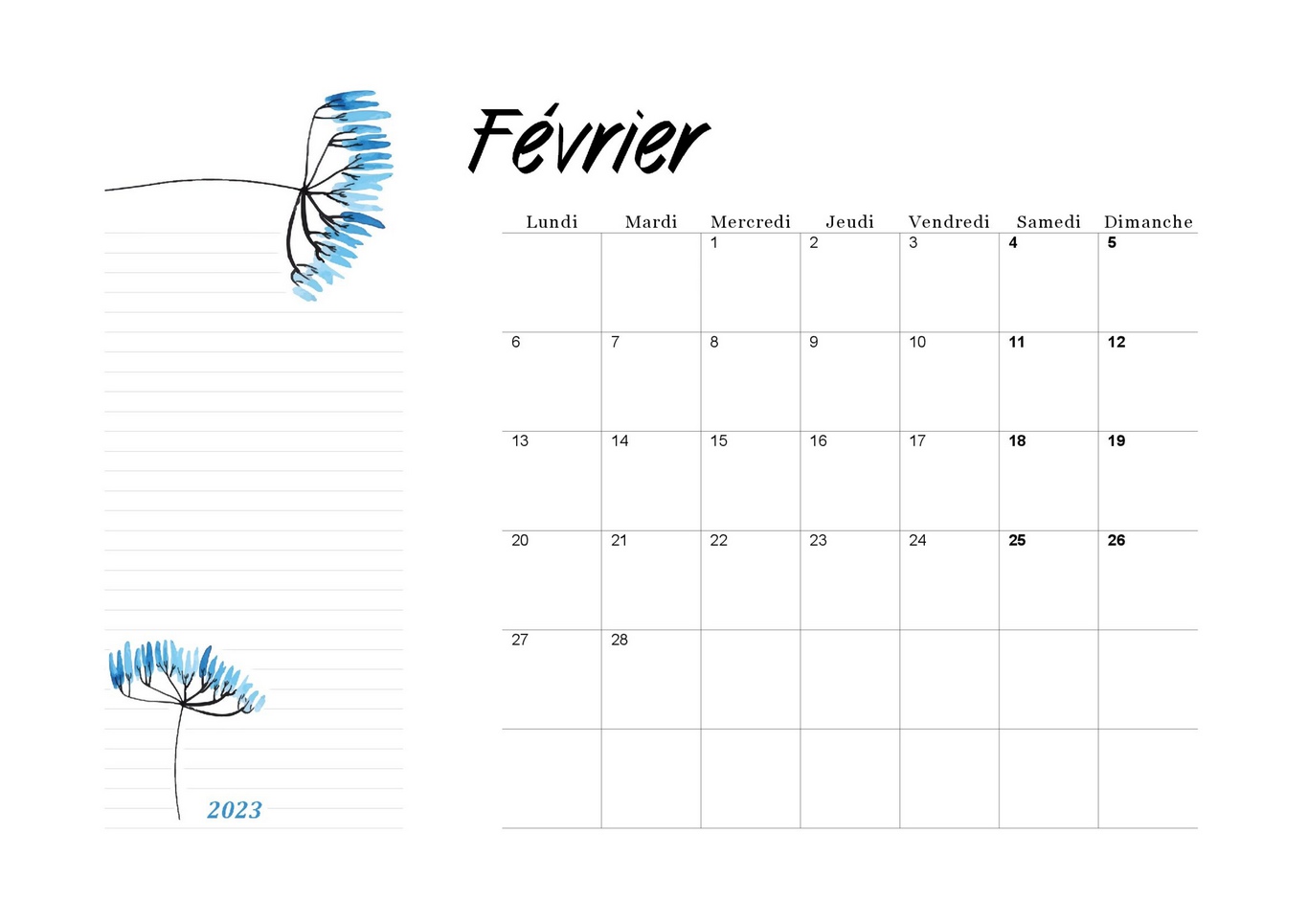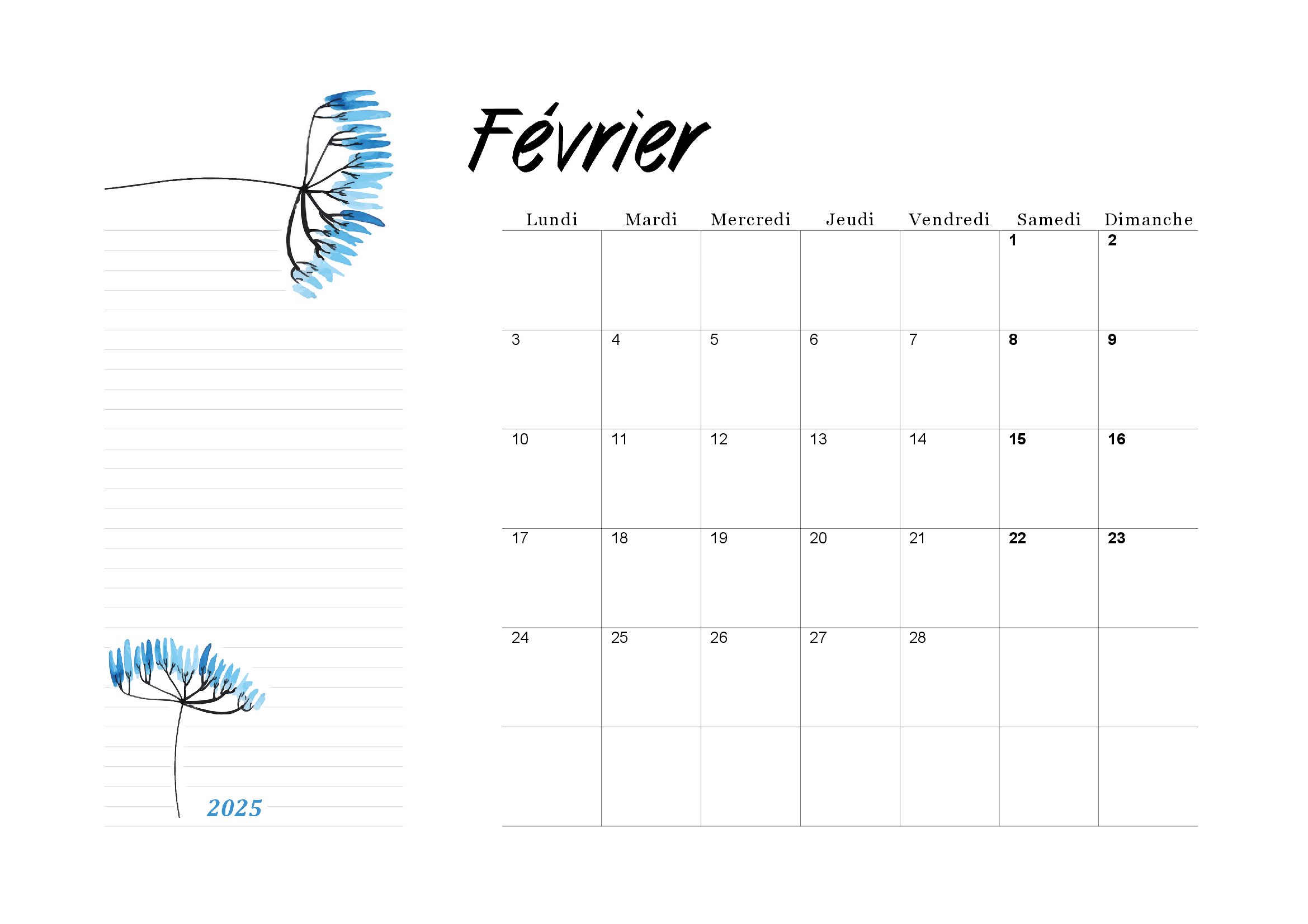 5. Calendrier du mois de février 2025 au format paysage A4.