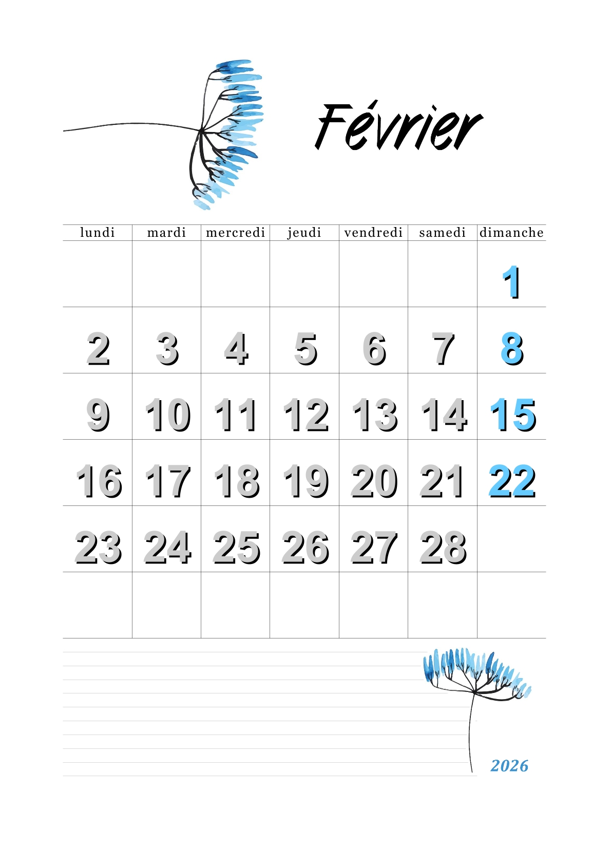 Calendrier du mois de février 2026