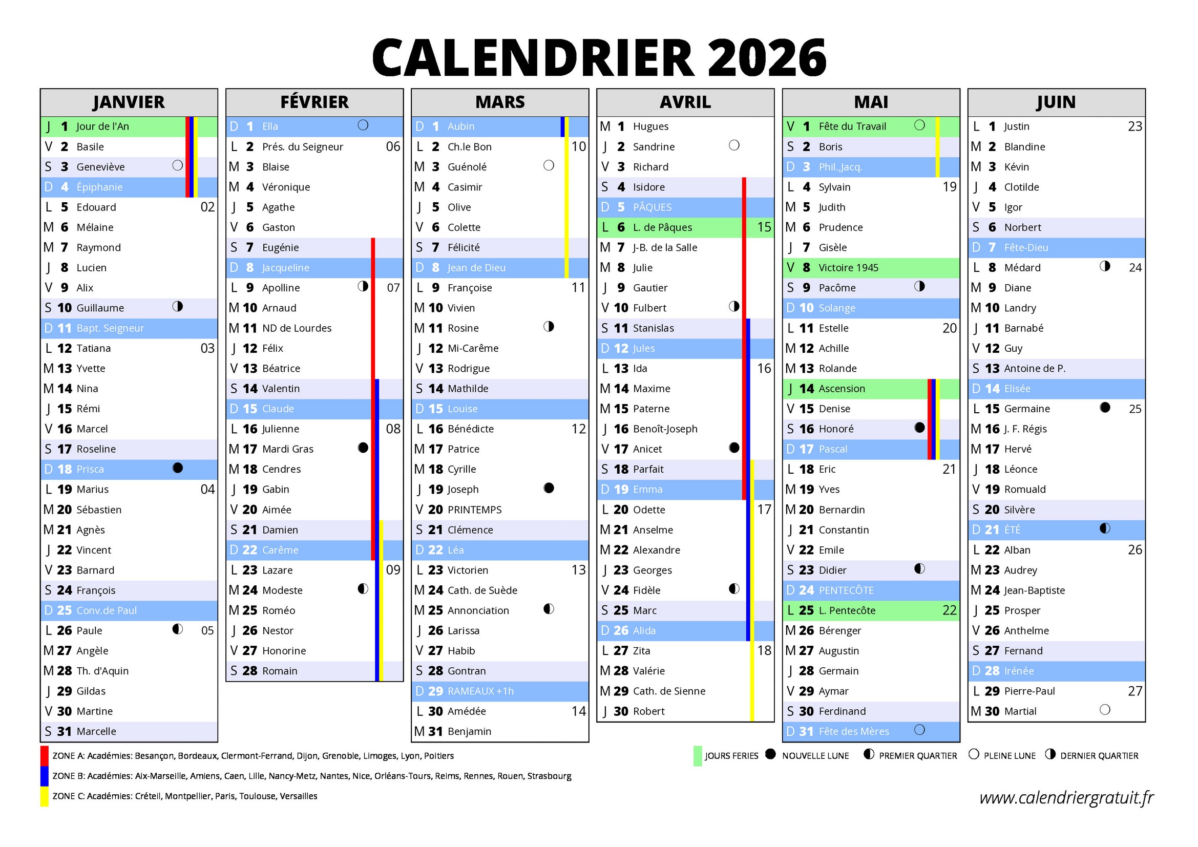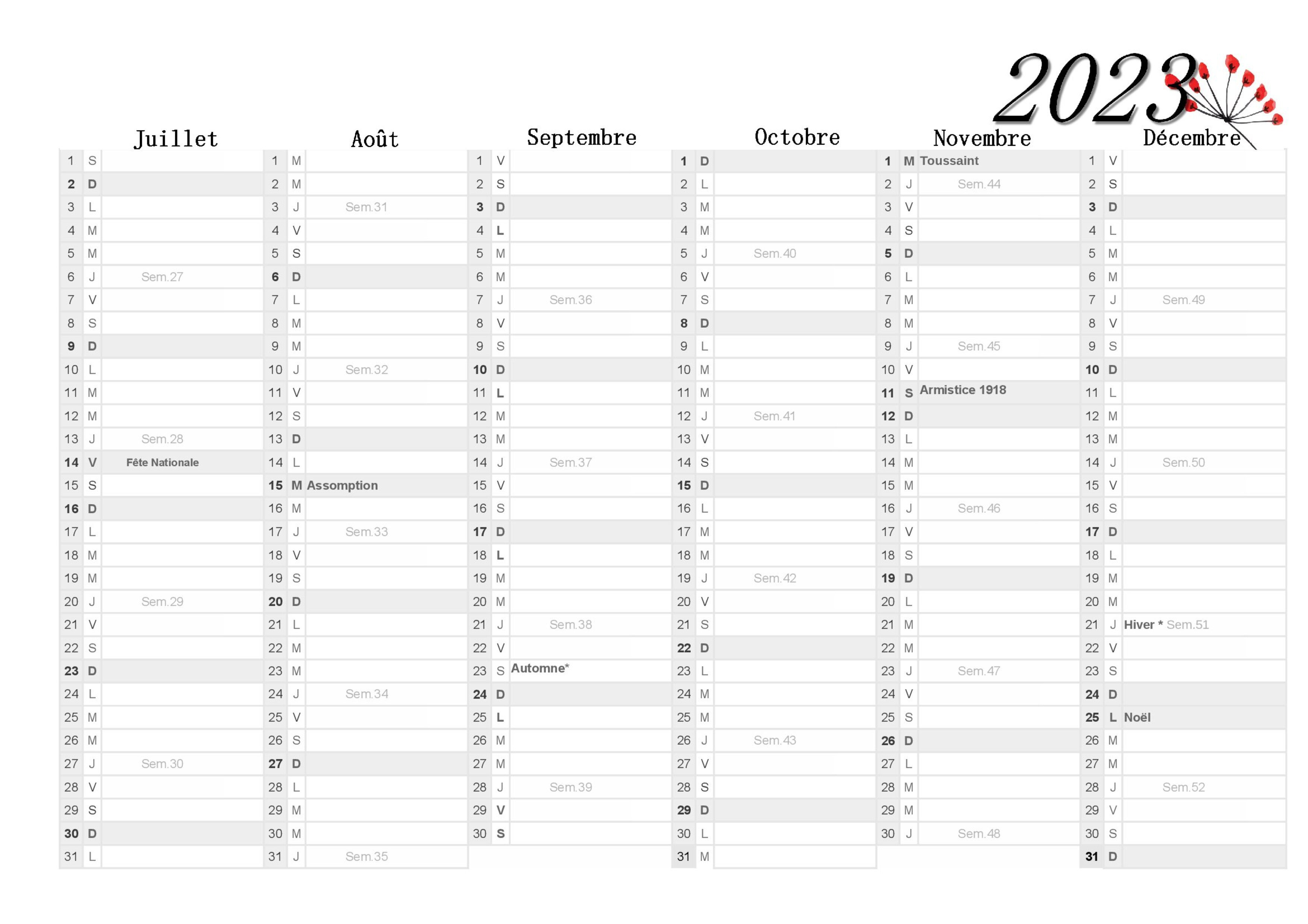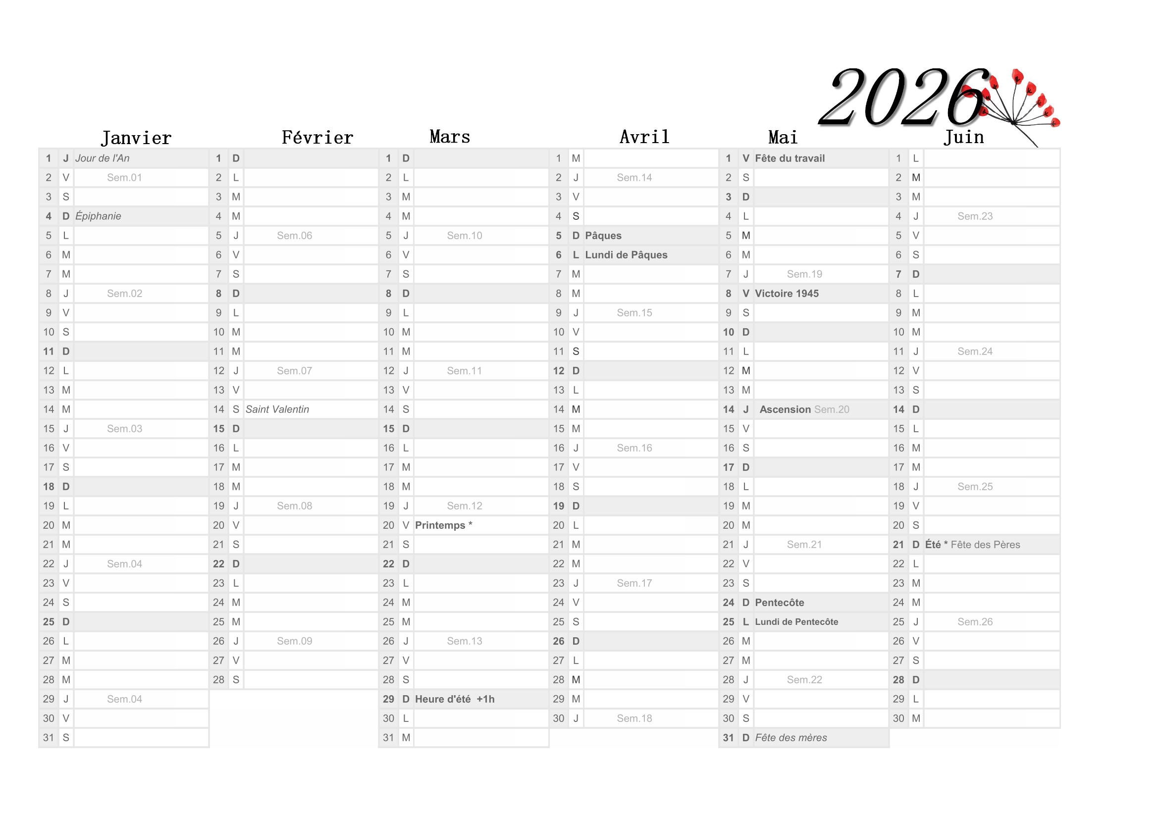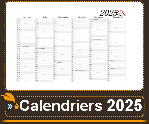 Parmi ceux-ci, vous en trouverez qui sont de type almanach avec des jours fériés, des numéros de semaine, des éphémérides avec lunaison, des jours de fêtes religieuses et civiles non fériés.