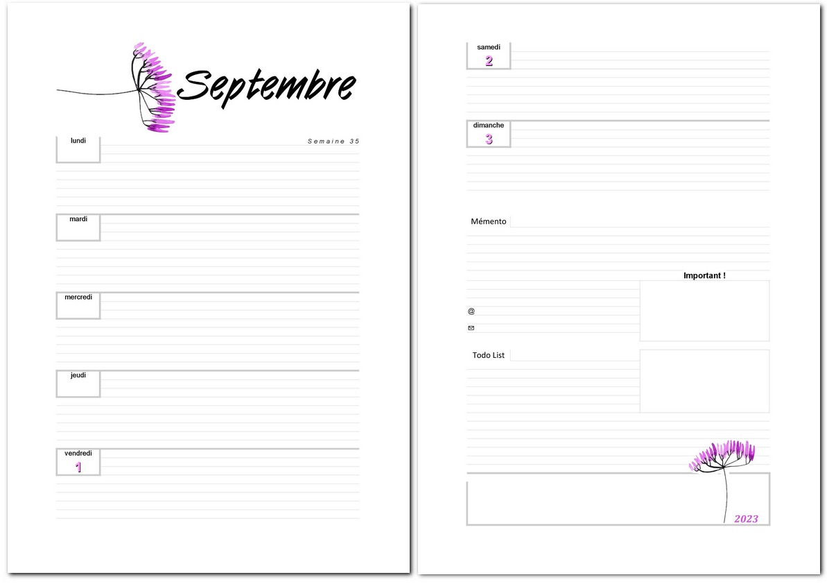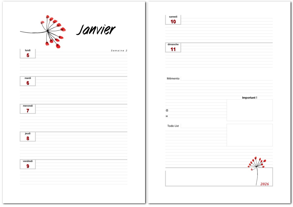 La plupart de ces modèles sont sous forme semestrielle ou annuelle pour plus de lisibilité et en mode paysage (horizontal) ou portrait (vertical) à imprimer sur une feuille de format A4, en recto verso par exemple.