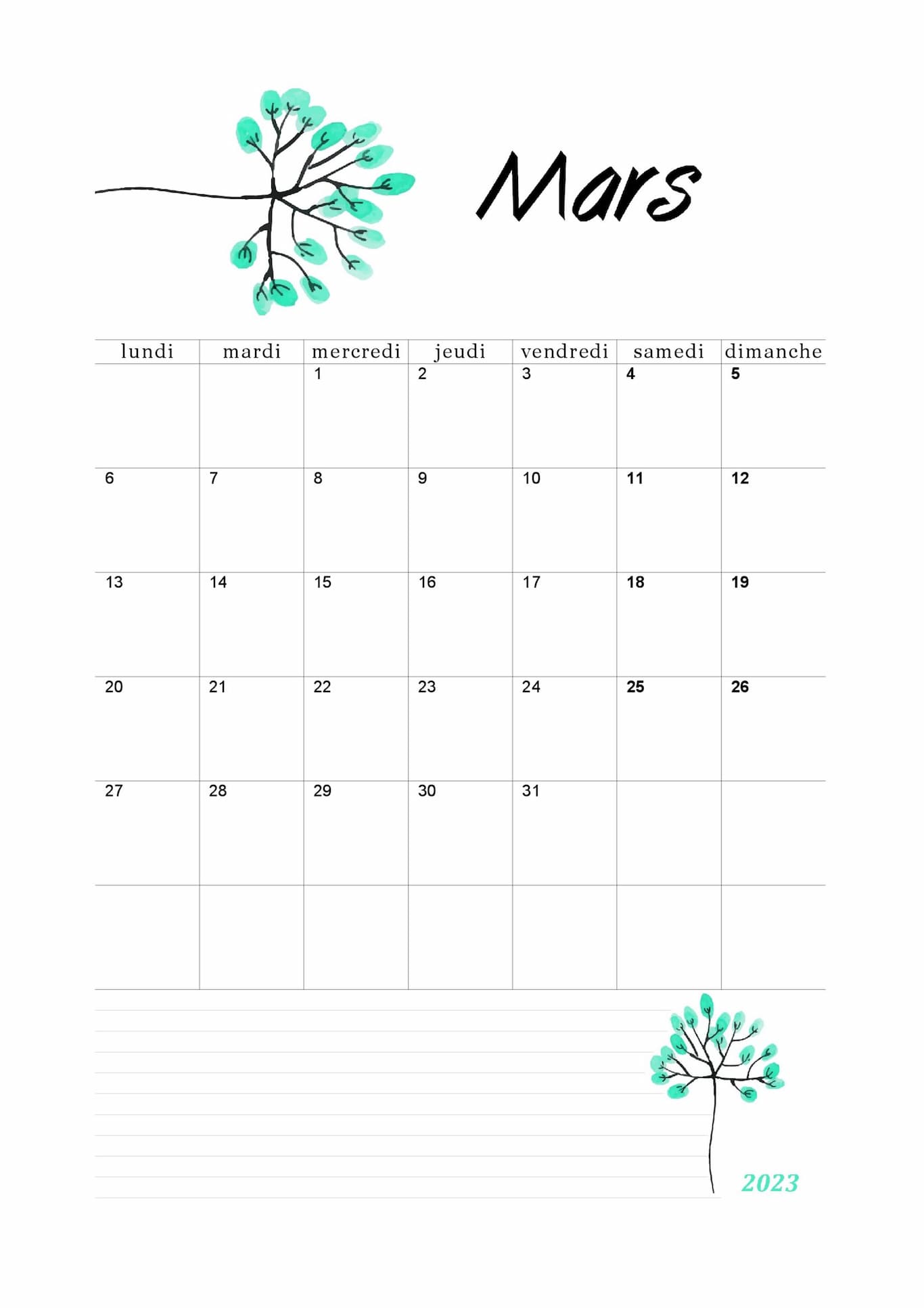 2. Calendrier du mois de mars 2025 au format portrait A4.
