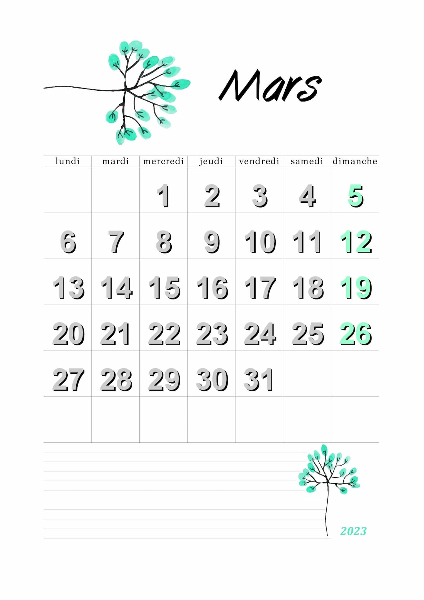 5. Calendrier du mois de mars 2025 au format paysage A4.