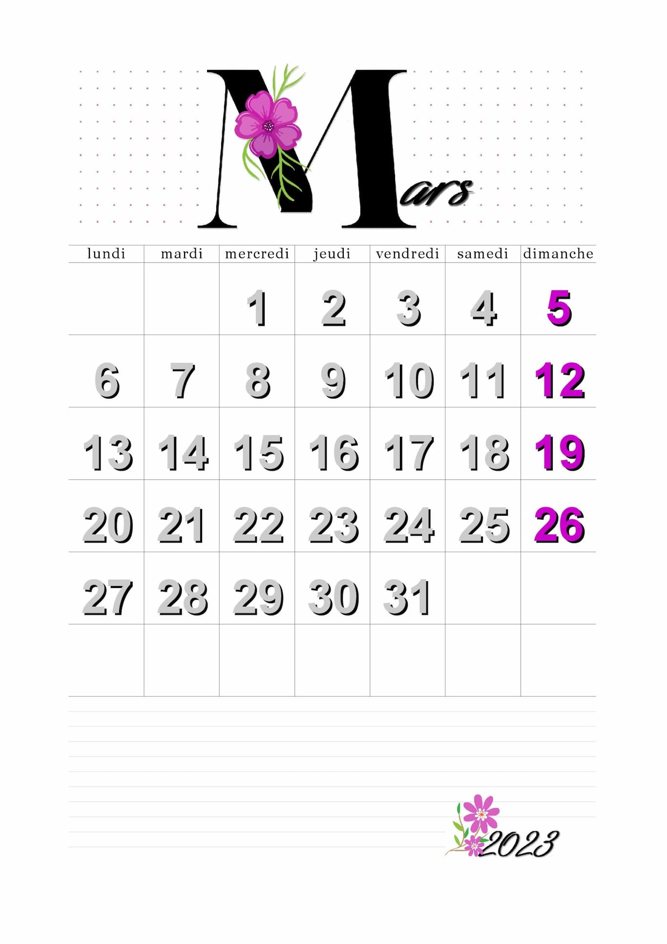 Calendrier du mois de mars 2025 à imprimer !