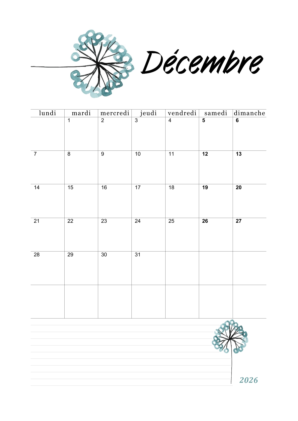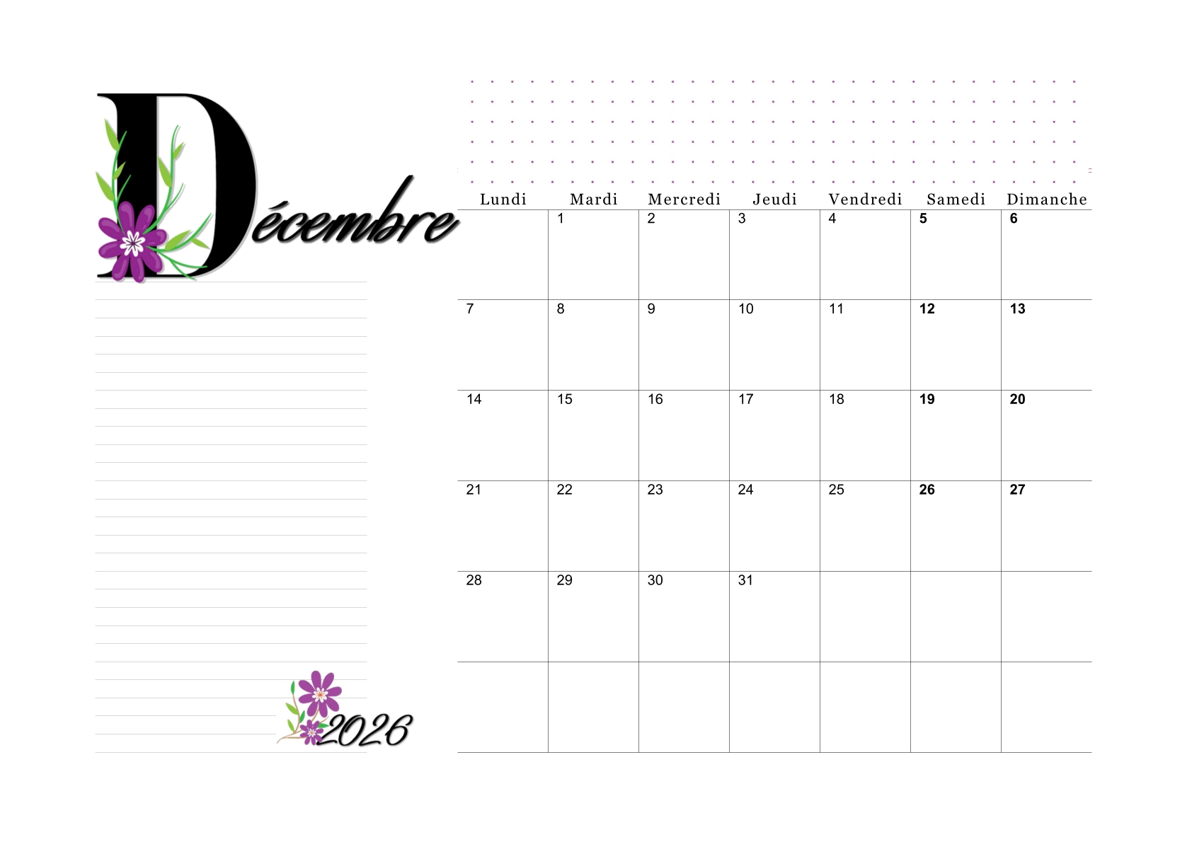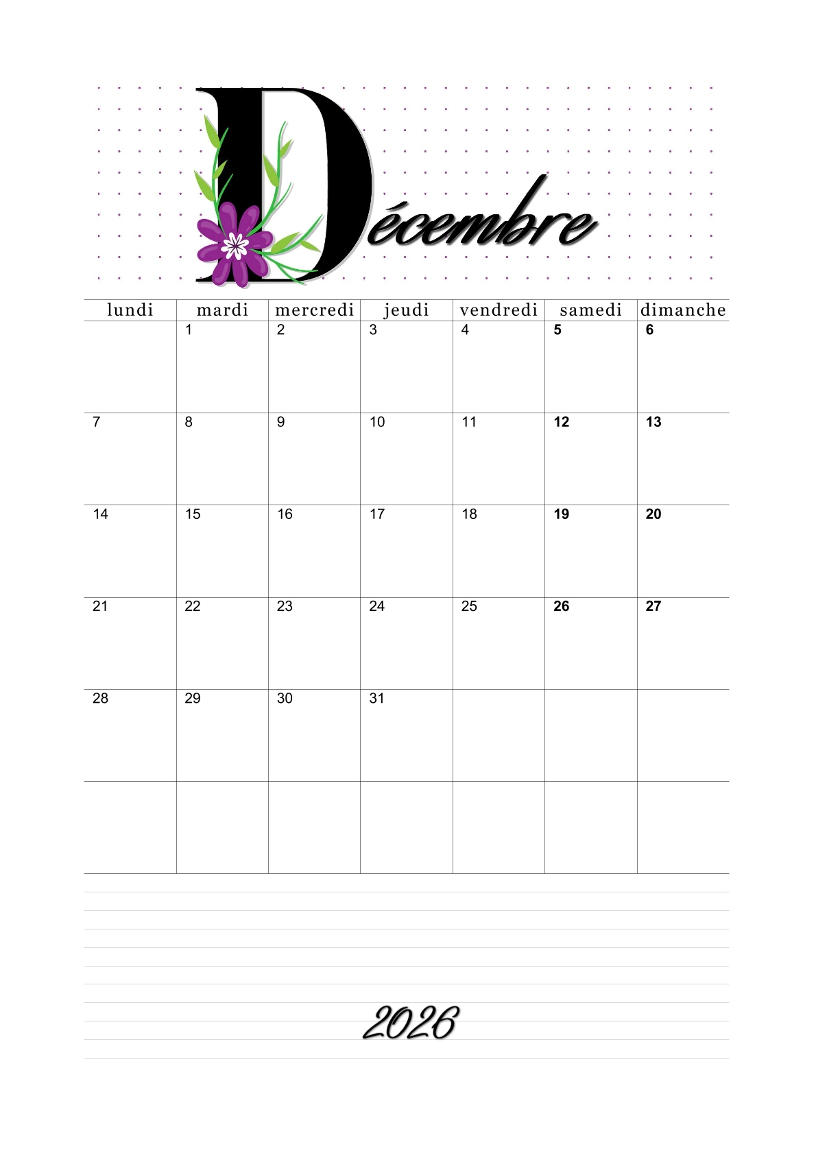 Téléchargez et imprimez nos calendriers mensuels de 2026 au format PDF A4, en orientation portrait ou paysage !