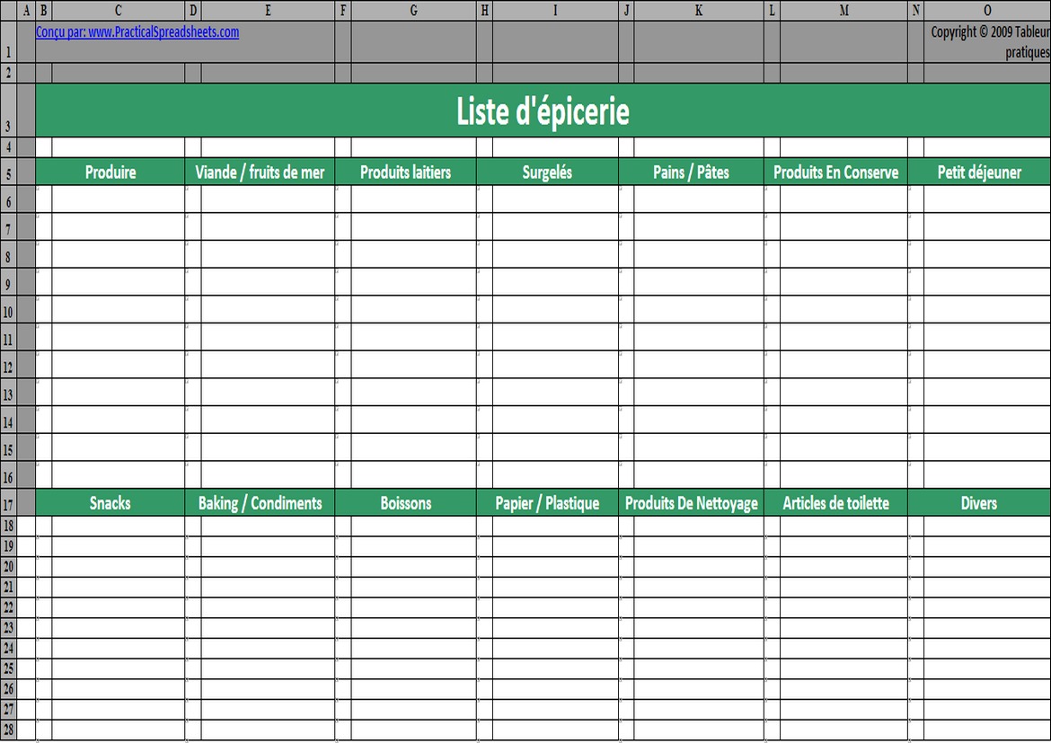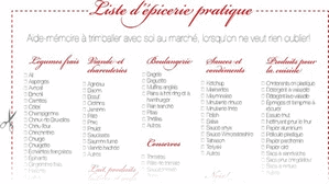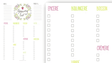 Voici une liste d'épicerie toutes prêtes à imprimer proposées par le site coupdepouce.com. Cette liste vous fera gagner du temps puisqu'elle liste les différents articles un peu comme celle proposée ci-dessus.