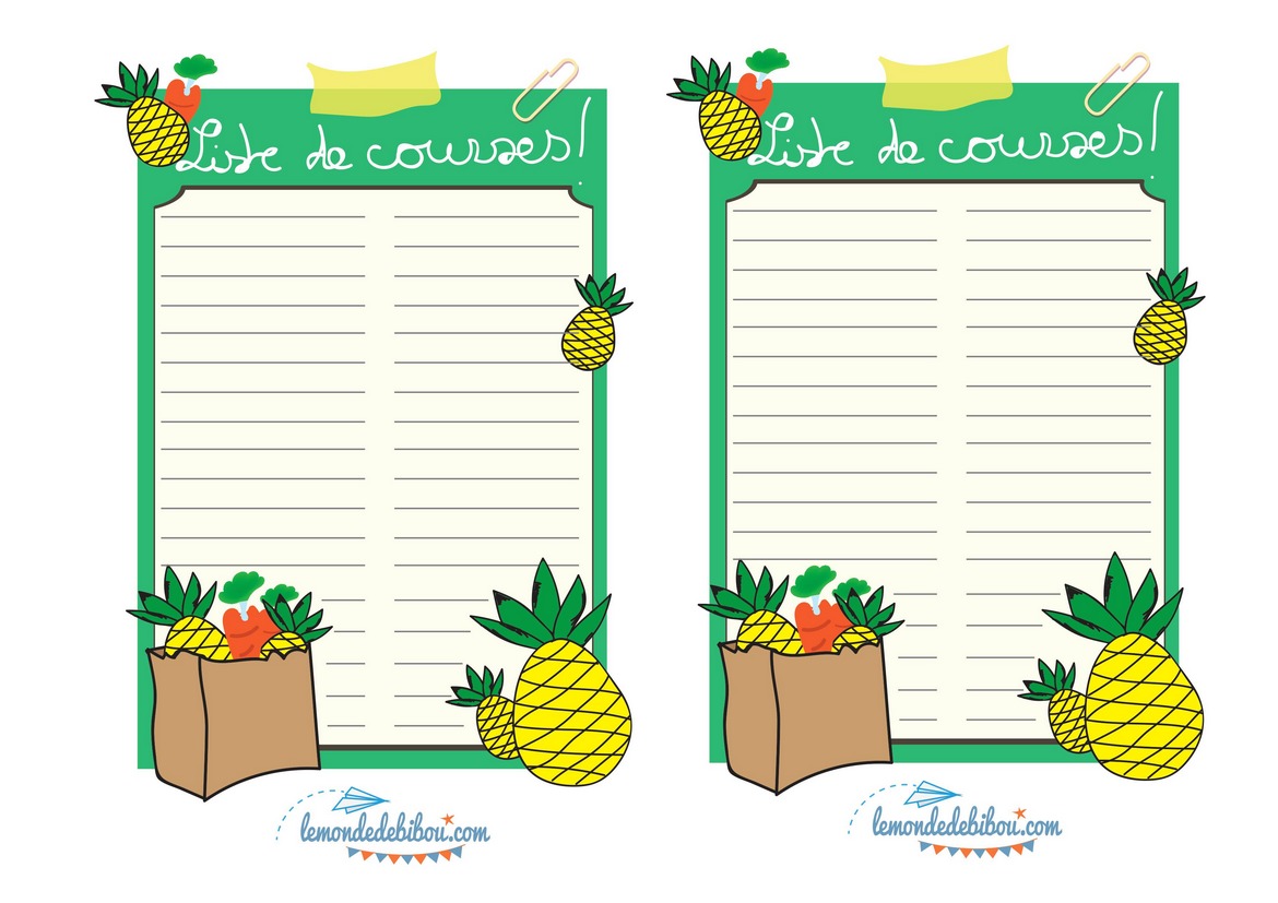 Erika, graphiste et organisatrice d'événements, vous offre sur son blog lemondedebibou.com, sa double liste de courses vierge, illustrée avec des ananas.
