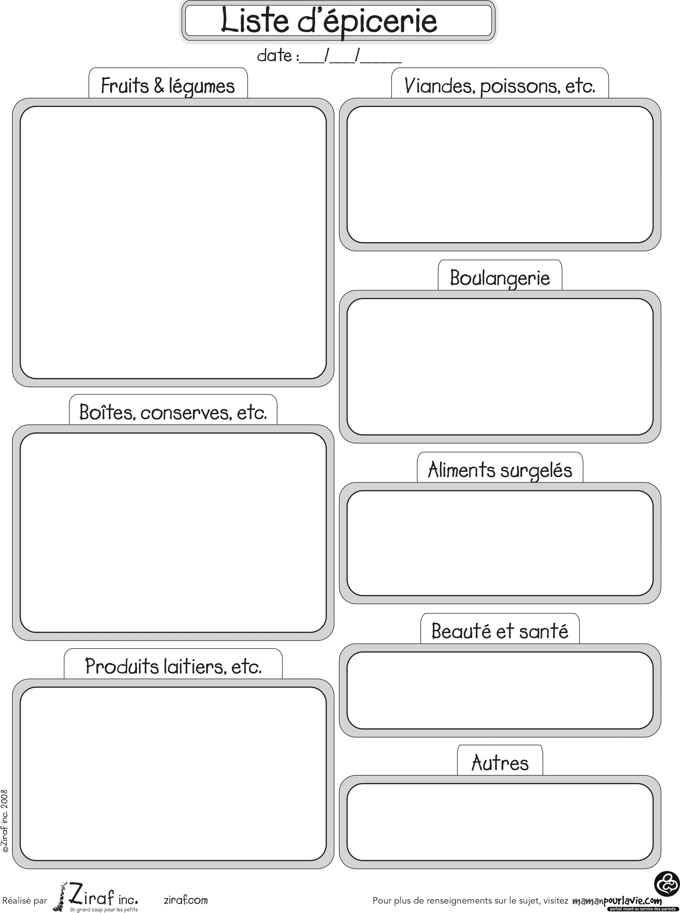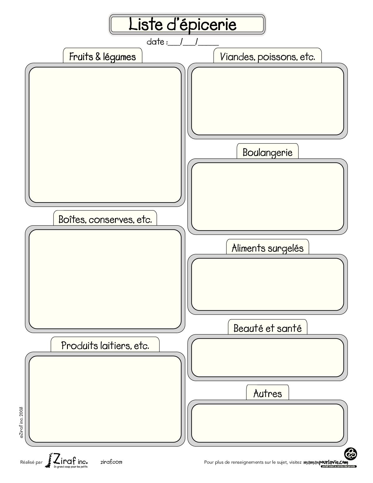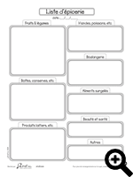 Dans le fichier PDF original, vous trouverez une version en orange et une, en noir et blanc. Plus, une liste de courses ou d'épiceries proposant plusieurs cases à remplir, comme, par exemple, les conserves, fruits et légumes, viandes ou poissons, etc.