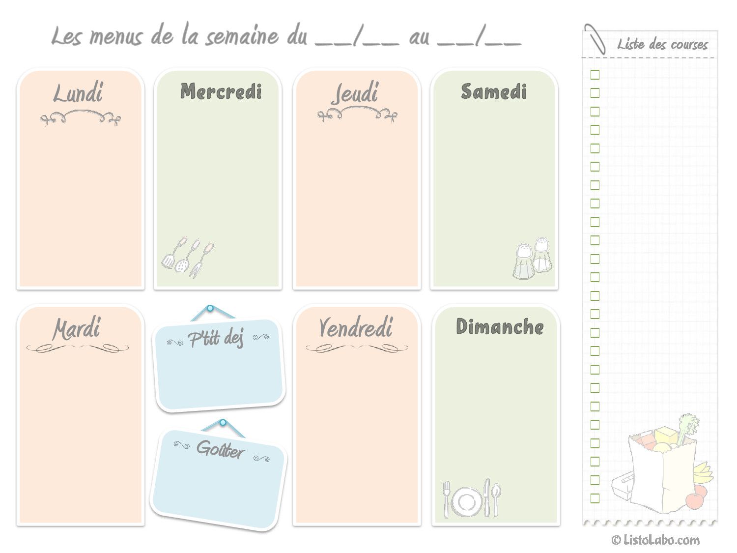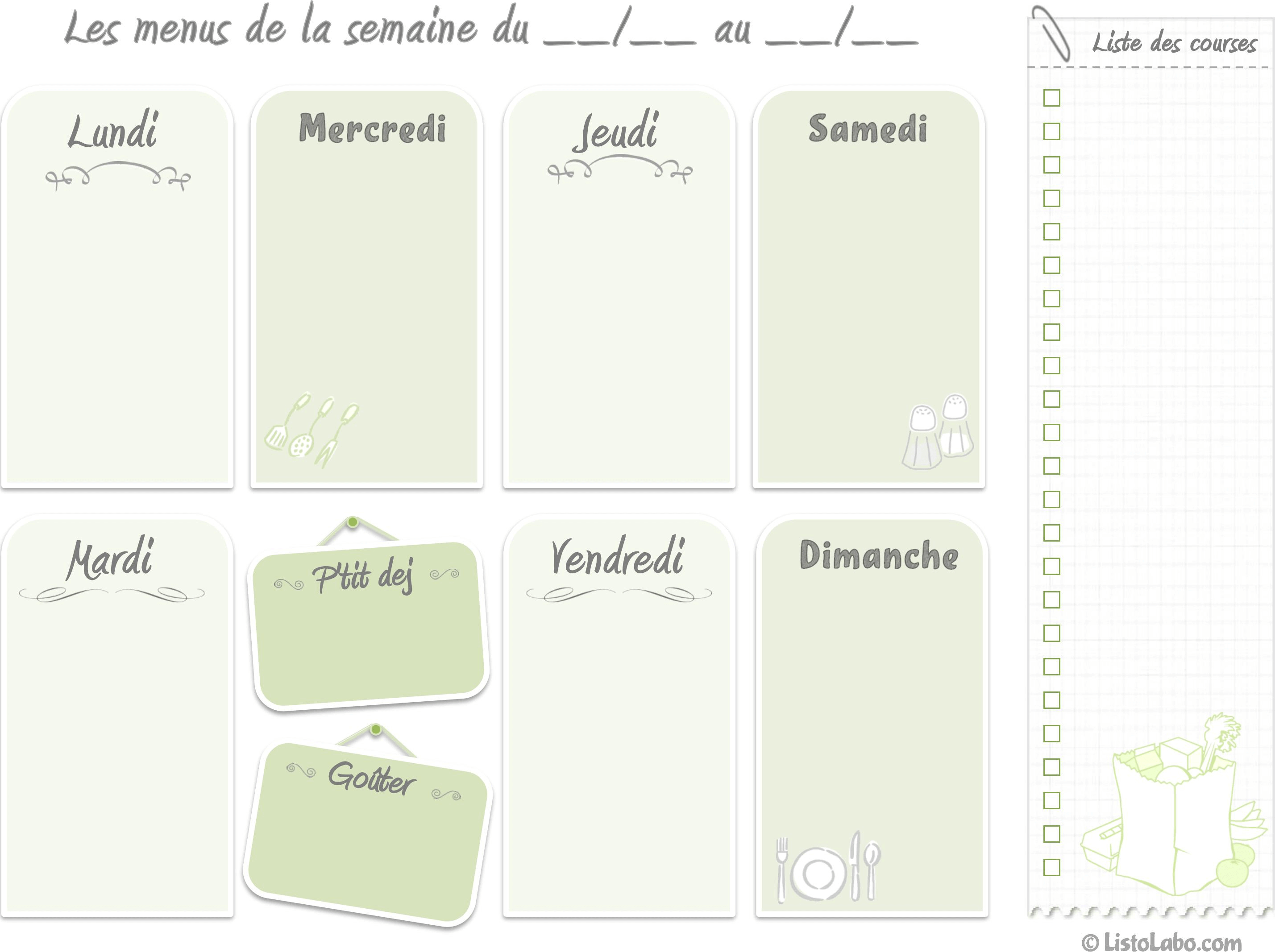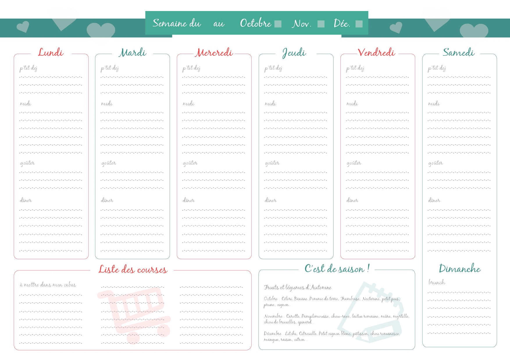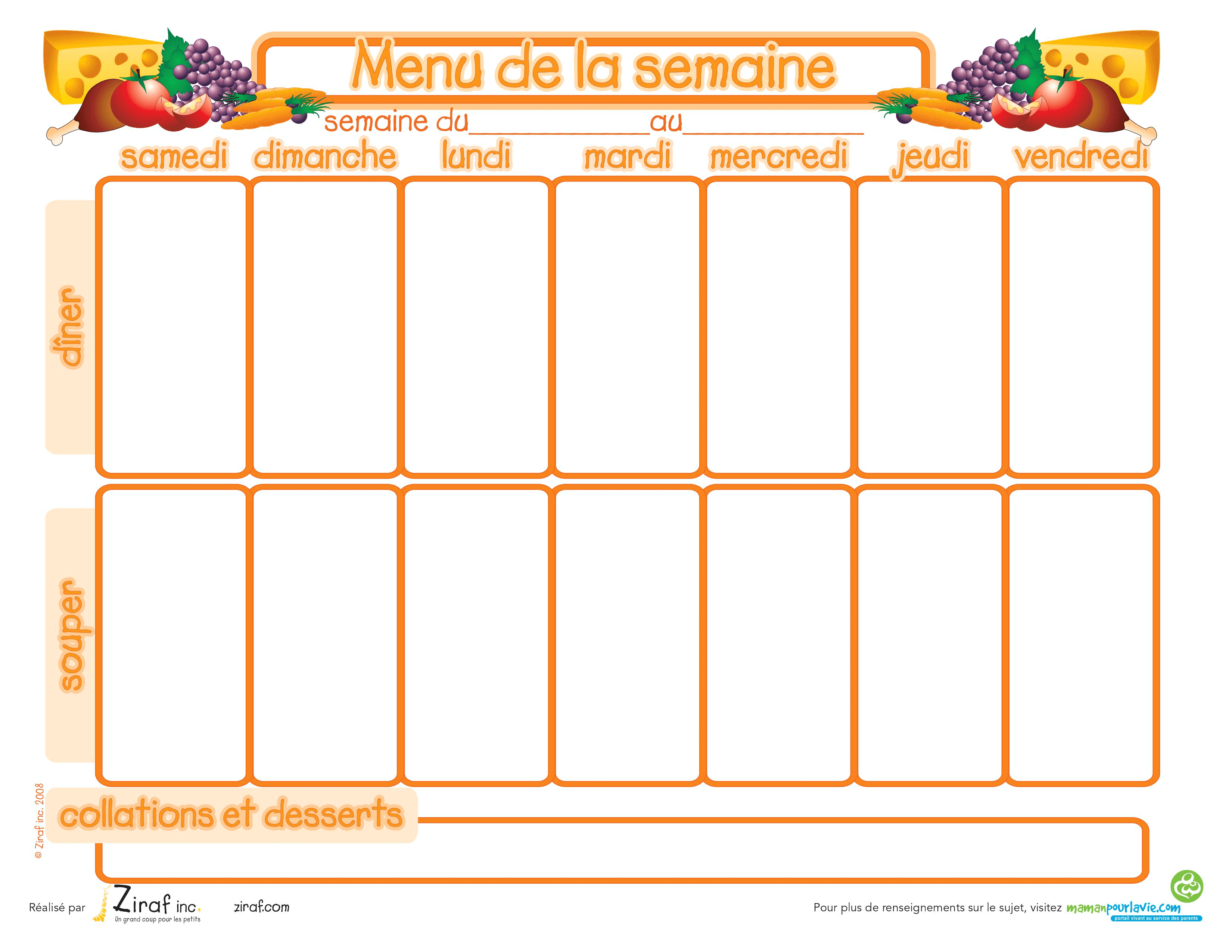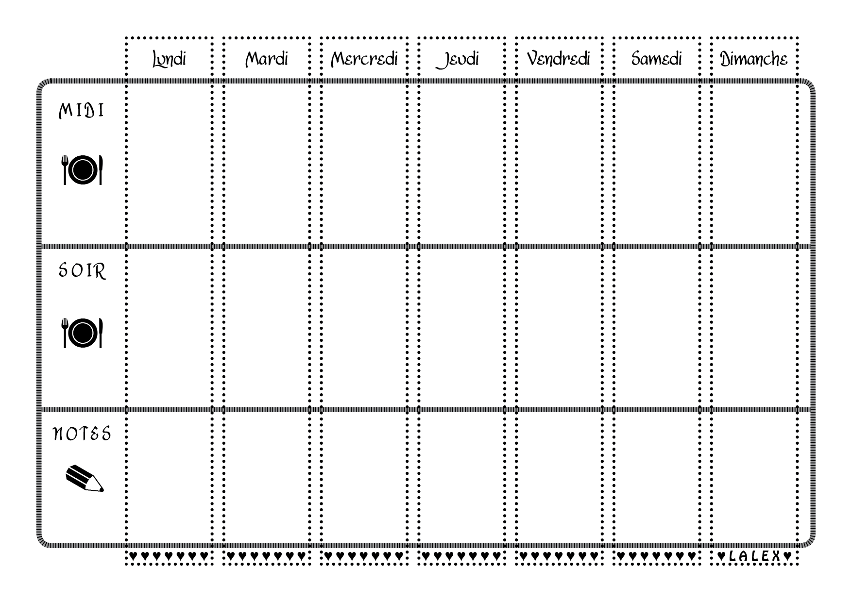 Un autre modèle de planning pour les menus de la semaine vierge, plutôt bien pensé, mais en version image uniquement.