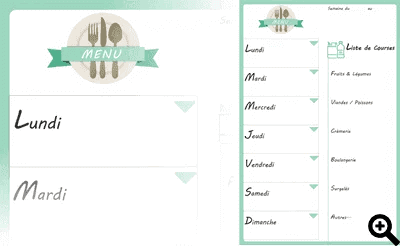 Nous vous proposons cet organisateur de menu, pour la planification de vos repas hebdomadaires. Celui-ci existe, en quatre versions à télécharger et s'imprime en mode paysage / horizontal.