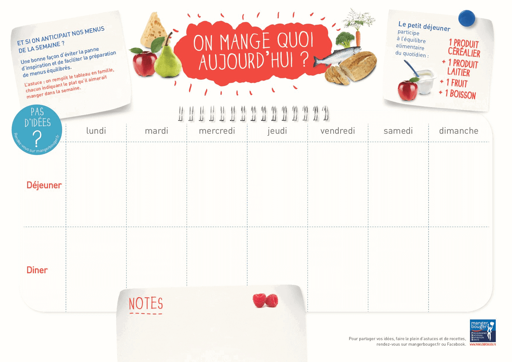 Visitez la page de l'auteur (faute de ne pas avoir trouvé la source originale sur le site mangerbouger.fr) intitulé « Semainier de repas. »