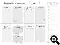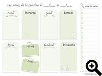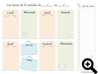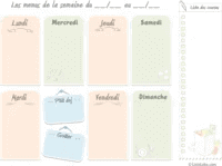 Sont inclus dans ce modèle en plus des jours pour y noter vos repas, une petite case centrale pouvant servir de bloc notes. De plus vous trouverez avec ce menu une page de quatre petites listes de courses à découper.