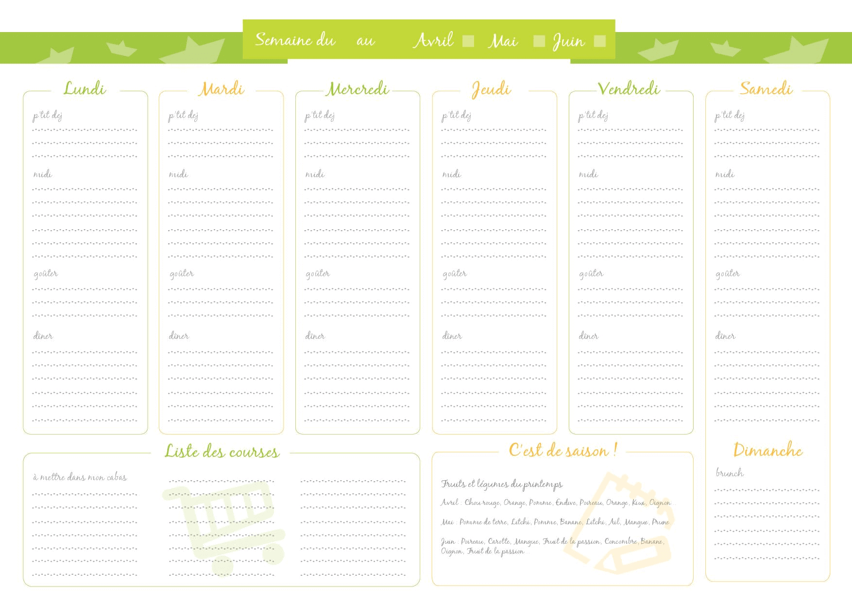 Sont inclus dans chaque modèle vierge : une ligne pour le petit déjeuner, une pour le midi, une pour le goûter et une pour le dîner. Du côté pratique, une petite liste pour les courses est également disponible, avec comme petit rappel, les noms des fruits et des légumes de saison.