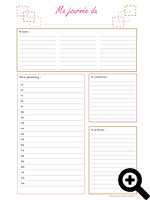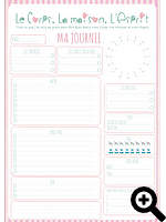 Il se compose de quatre parties. Une pour les choses à faire, une partie planning avec horaires de 5 h 00 à 23 h 00, une partie pour noter les rendez-vous ou personnes à contacter et une partie pour inscrire la liste des choses à acheter. Il s'imprime en mode portrait (verticale) en format A4.