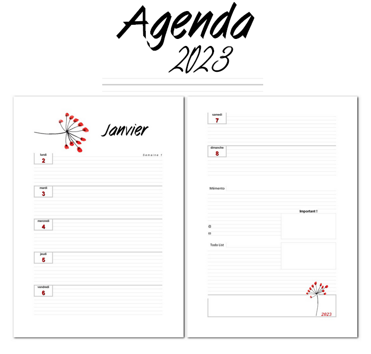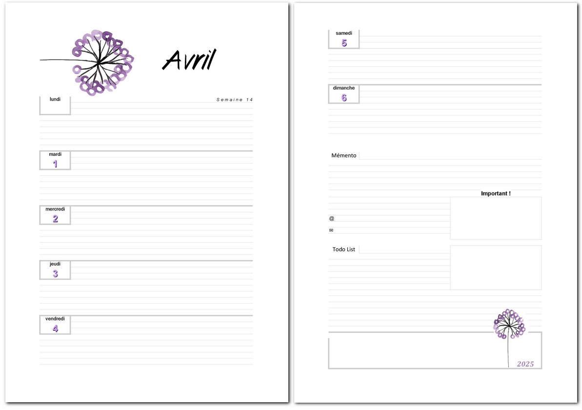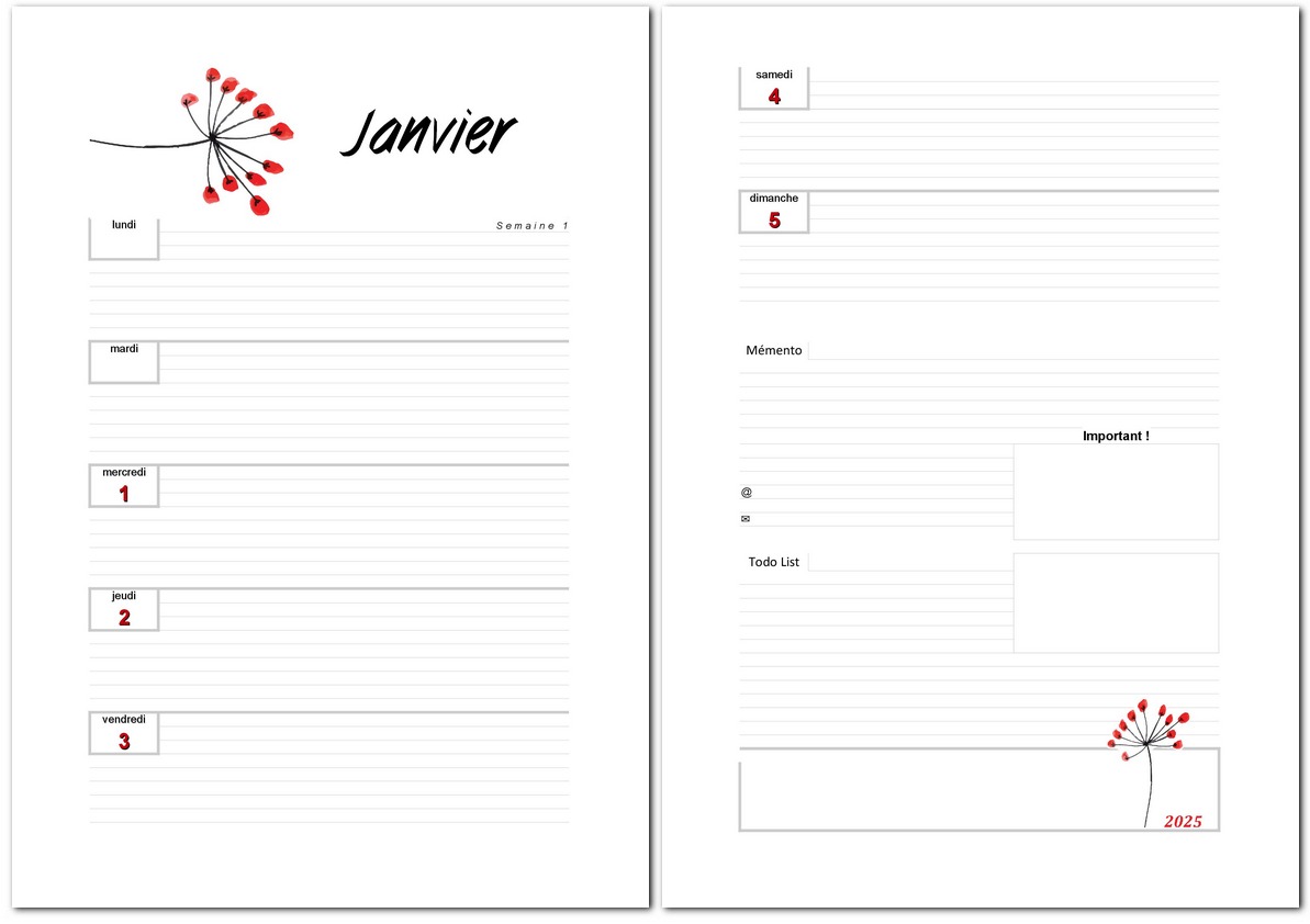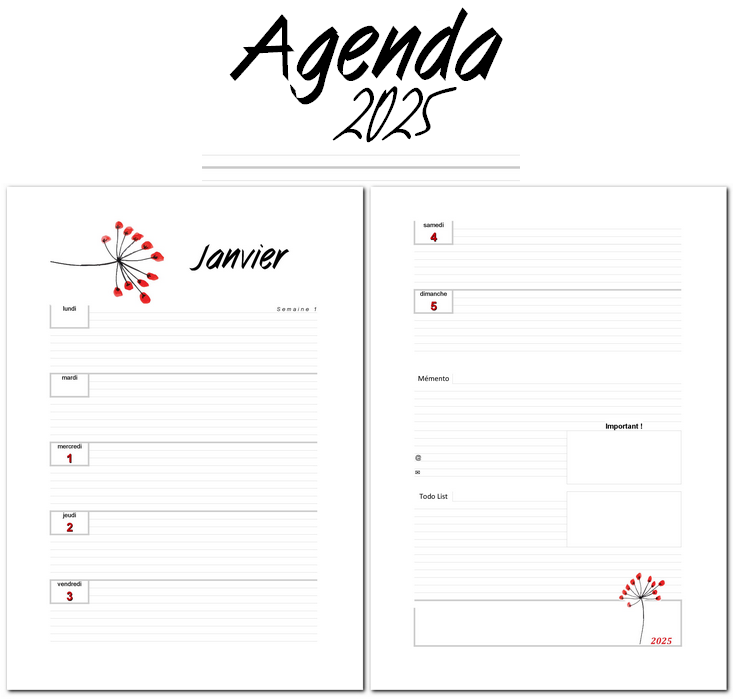 Nous avons créé un agenda gratuit à imprimer pour 2025 (de type semainier) au format PDF sur deux pages de format A4 ou A5, avec un côté organisateur chaque fin de semaine.