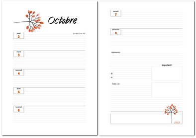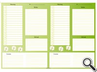 Ceux-ci ce présentent sous la forme d'une fiche hebdomadaire et d'un planning quotidien sur deux jours. Le planning quotidien présente des cases avec les horaires de 6 h 00 le matin jusqu'à 23 h 00 le soir, avec une case des tâches à effectuer, des cases pour une liste de courses et des cases pour noter les numéros de téléphone et adresses mails.