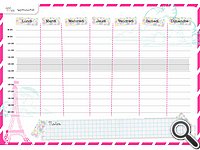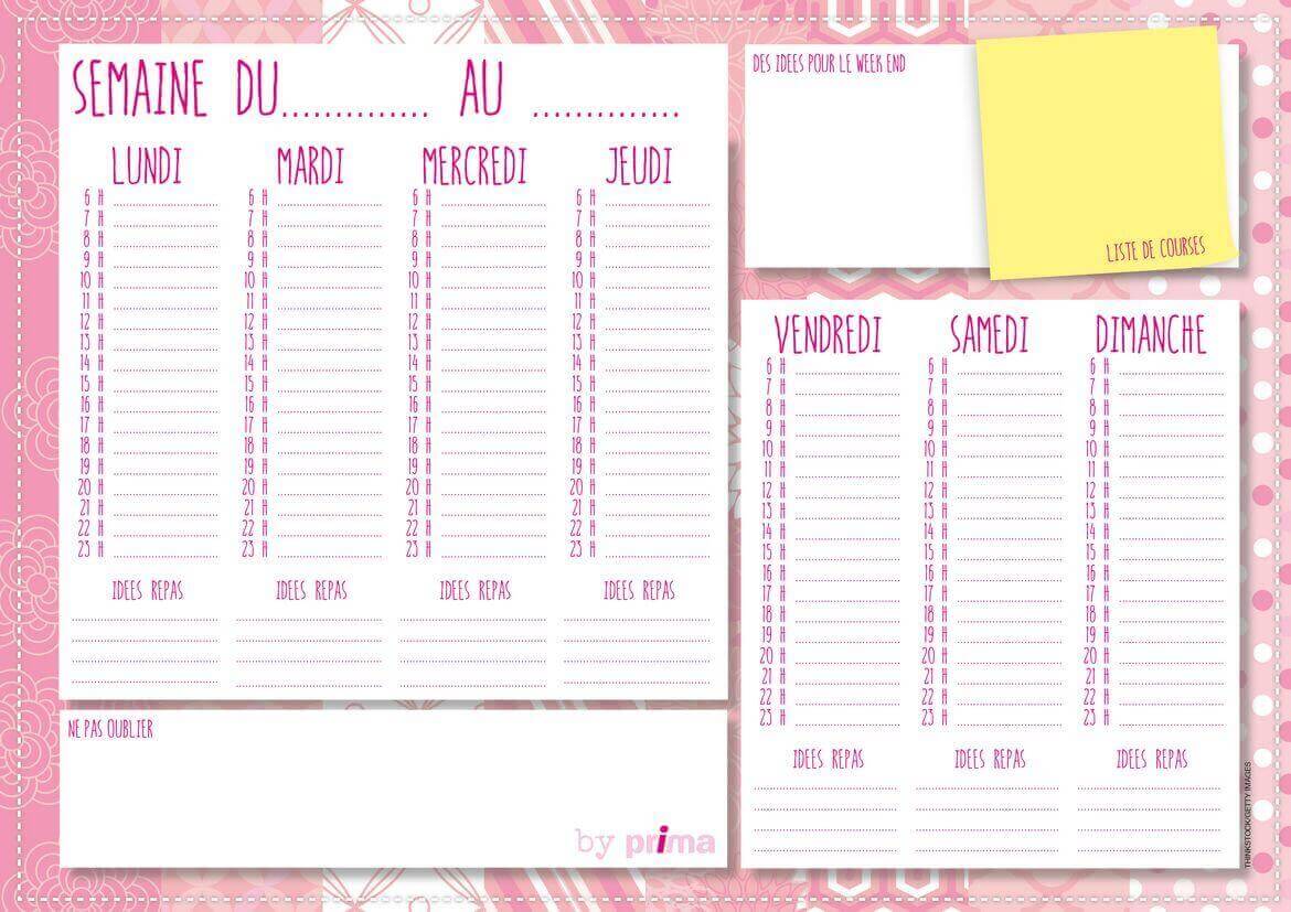 Ils sont tous au format images dans des styles et des couleurs différentes. Sont inclus dans ces modèles et pour chaque jour, les horaires de 6 h 00 à 23 h 00 du lundi au dimanche, avec en bas de chaque jour des lignes pour y noter vos repas, mais aussi une case " Ne pas oublier " ainsi qu'un post-it " Liste de courses " et une case " Des idées pour le week-end ".
