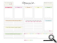 Sont inclus les jours de la semaine du lundi au vendredi, une case post-it, une case "objectif", une case à lire/voir, une case liste et une des belles choses à se souvenir.