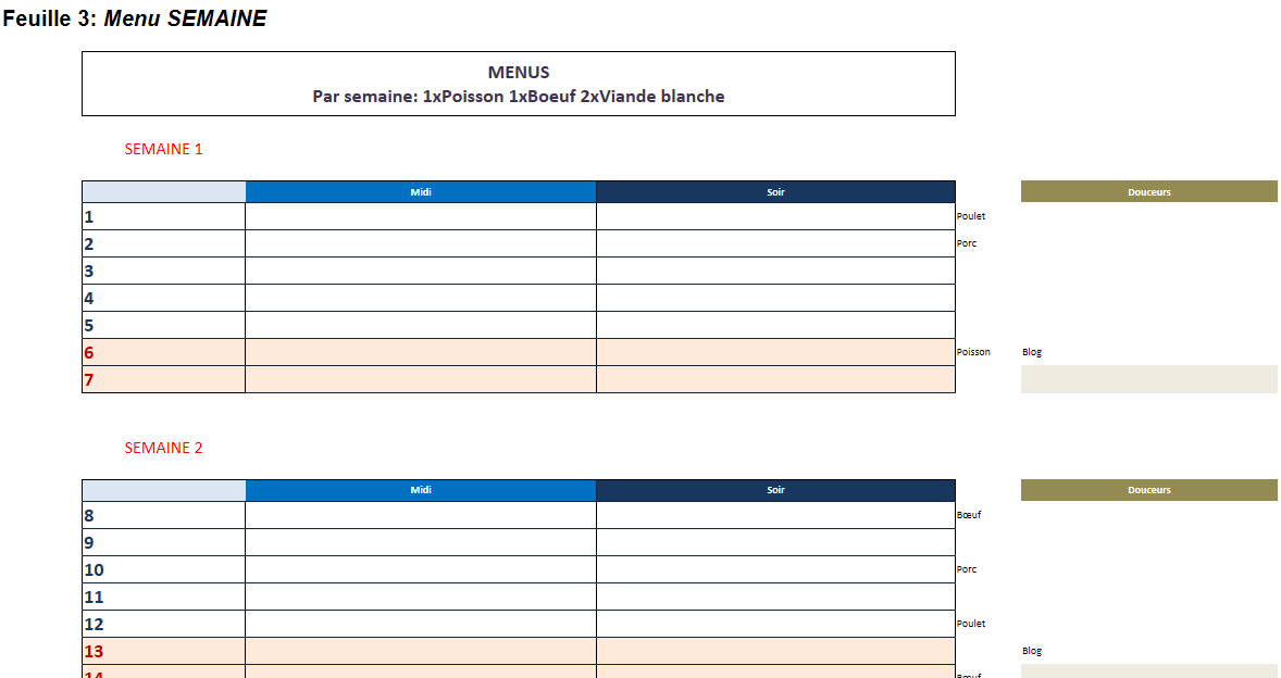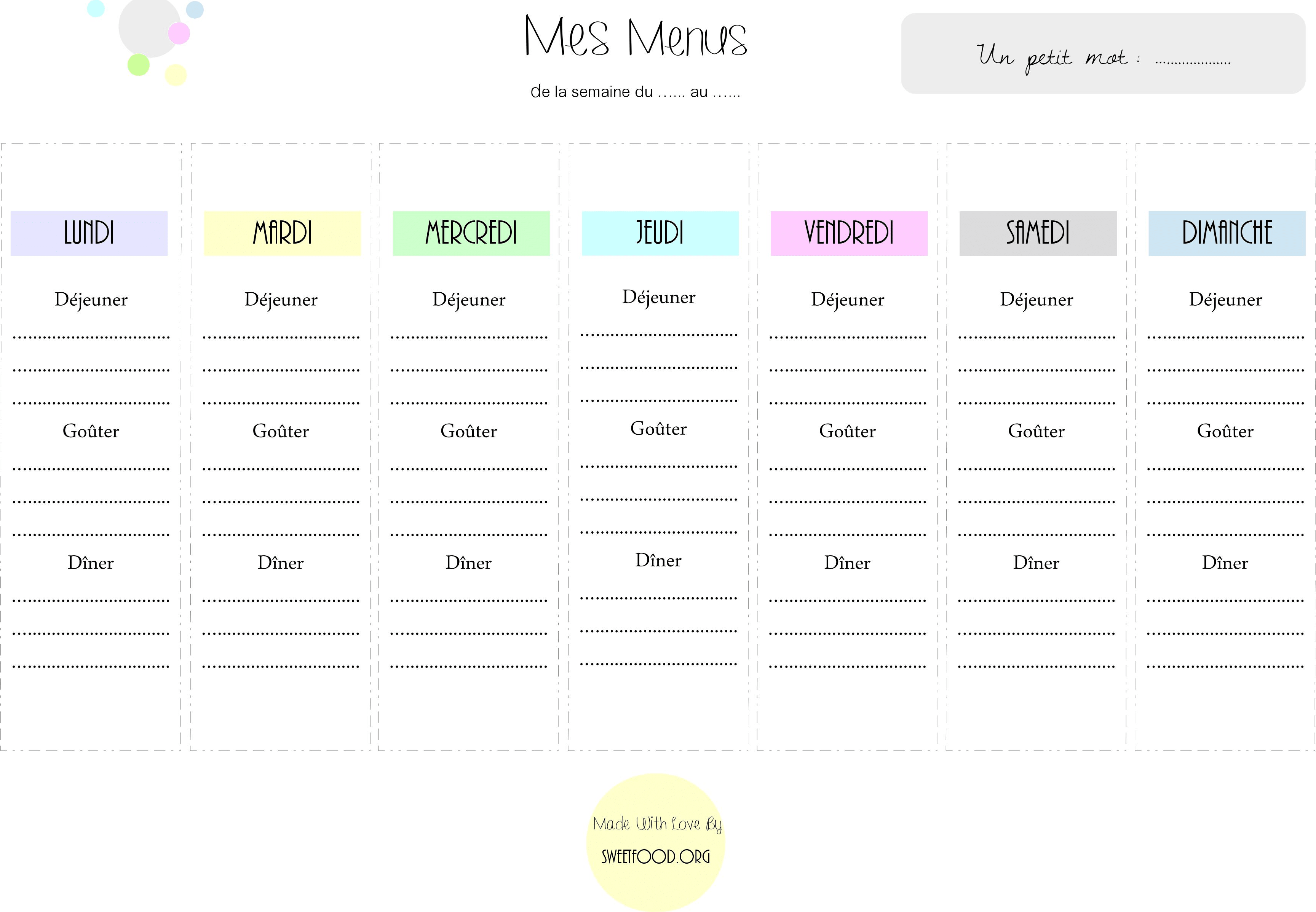 Le blog Sweet Food propose son planificateur de menus hebdomadaires imprimable.