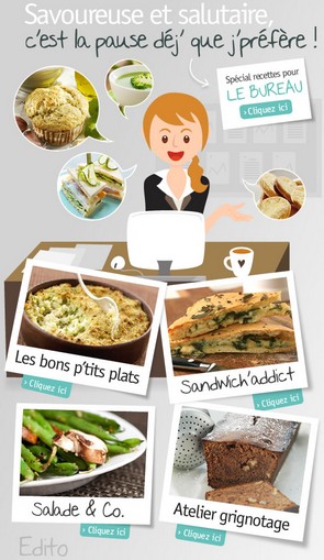 Savoureuse et salutaire c'est la pause déj' que j'préfère ! C'est le titre du dossier paru sur cuisineaz.com intitulé " Manger au bureau : La recette idéale de manger au bureau sur Cuisine AZ ", au sommaire : spéciales recettes pour le bureau, les bons p'tits plats, sandwich 'addict, salade & Co et un atelier grignotage. Le petit plus, des idées de repas du midi, les bentos du blogdechataigne.fr & d'autres recettes pour bentos du blogdechataigne.fr.